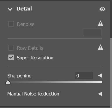 - Camera Raw 창에서 Detail 탭 > Super Resolution > Open