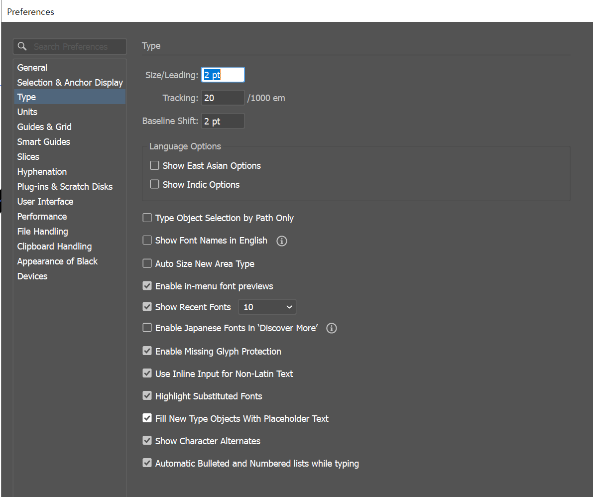 2. Edit > Preferences > Fill New Type Objects With Placeholder Text 체크 해제하기