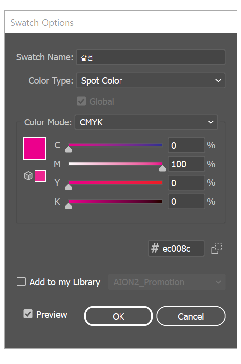 칼선 제작 (Vector, 면이 아닌 선 속성으로(No fill), 0.25~0.5pt, 100% Magenta Spot Color 지정 권장)